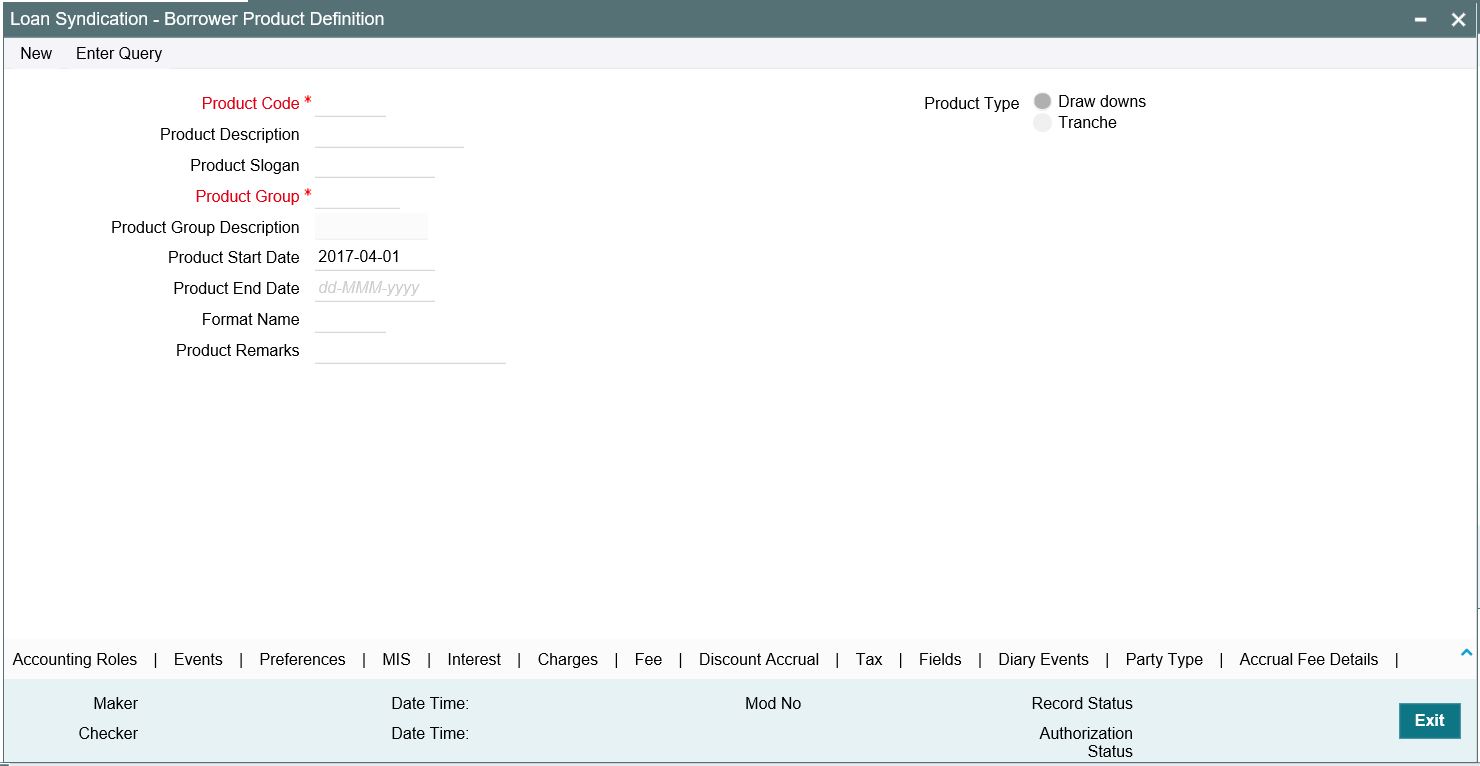You can define the generic attributes specific to a borrower tranche/drawdown product in the ‘Loans Syndication – Borrower Product Definition’ screen.