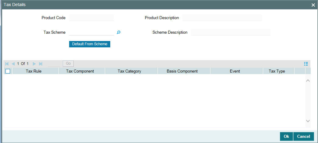 A tax scheme is made applicable to a product when it is linked to the product. Select the applicable scheme from the list. The tax schemes maintained through the ‘Tax Scheme Maintenance’ screen are available in the option list provided.