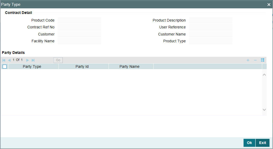 Select the party type to be associated with the borrower facility contract. The party type associated to the product is defaulted here. However you can modify it.