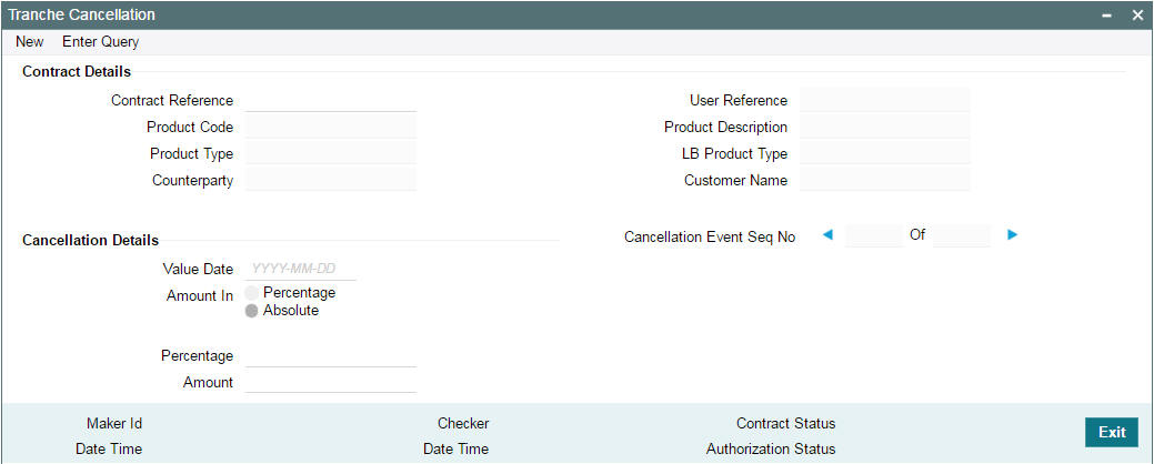 The main borrower facility contract is the one under which all subsequent tranche / drawdown contracts will be processed. When you enter this contract (with Mr. Robert Carr) into the system, it saves the contract and generates a unique identifier for it, known as the Facility Contract Reference Number. (that is, the Contract Reference Number of the main borrower facility contract). Let us suppose the Facility Contract Reference Number assigned to this contract is 000SNEW000010001. Whenever you enter a tranche or drawdown contract against this main borrower facility contract, you have to specify this number as reference information.