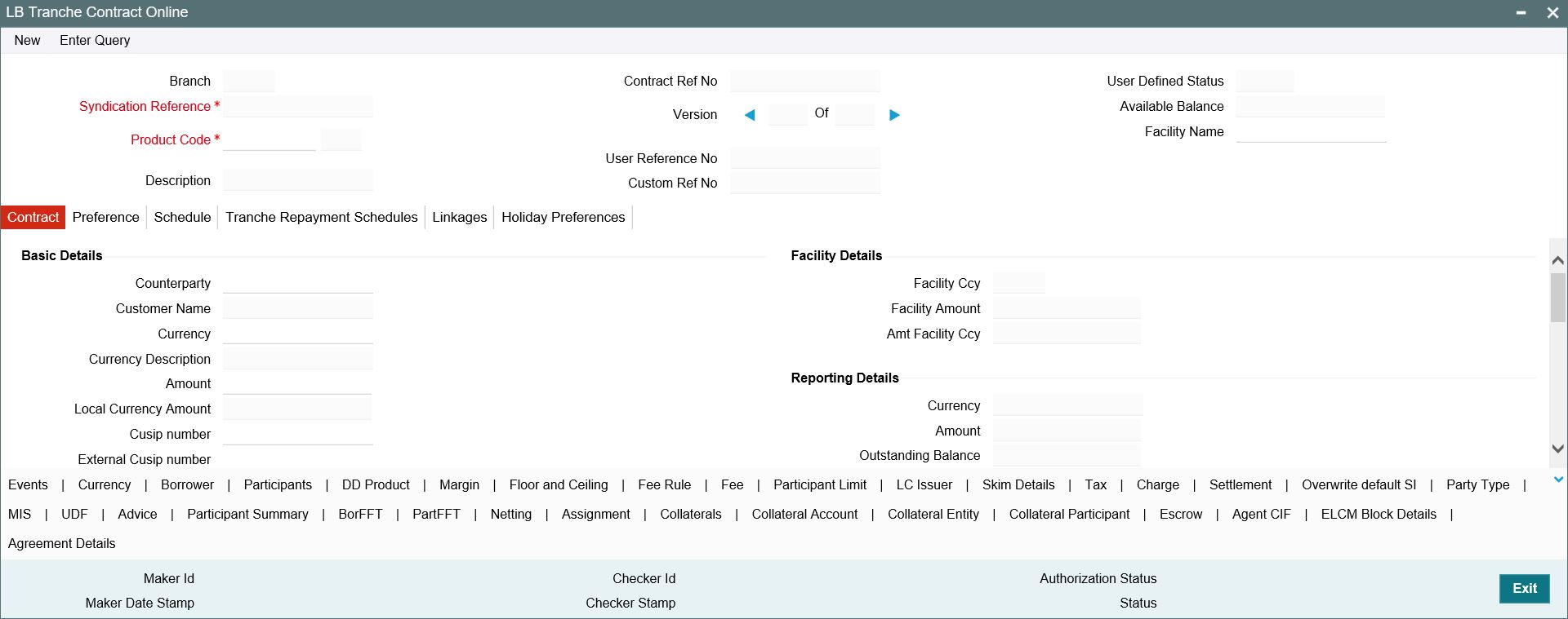 In the ‘Loans Syndication - Facility Contract Online’ screen, you can capture the following details: