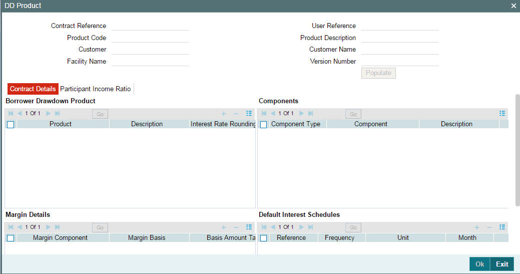 The following section explains the procedure for capturing the contract by associating it with a facility product. Based on the product code you choose, many of the fields are defaulted. You can overwrite some of these defaults to suit your requirements.