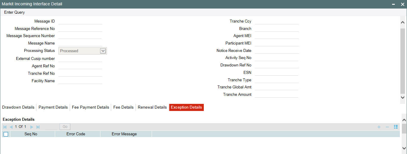 If the borrower mnemonics at tranche is maintained as ALL type (Product, Branch, Currency, module), then system marks the Processing status as ‘Enrich’ and you need to modify the mnemonics for the tranche and resubmit the message for processing by changing the Processing Status as ‘Pending’