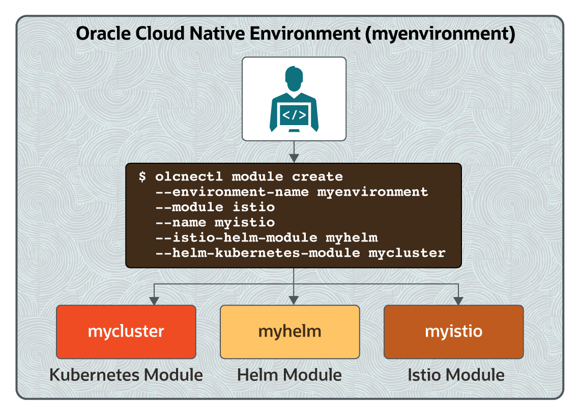 myclusterというKubernetesモジュールを使用します。そのモジュールに、myhelmというHelmモジュールをデプロイして、最後に、myistioというIstioモジュールを作成します。olcnectl module create \ --environment-name myenvironment \ --module istio \ --name myistio \ --helm-kubernetes-module mycluster \ --istio-helm-module myhelm