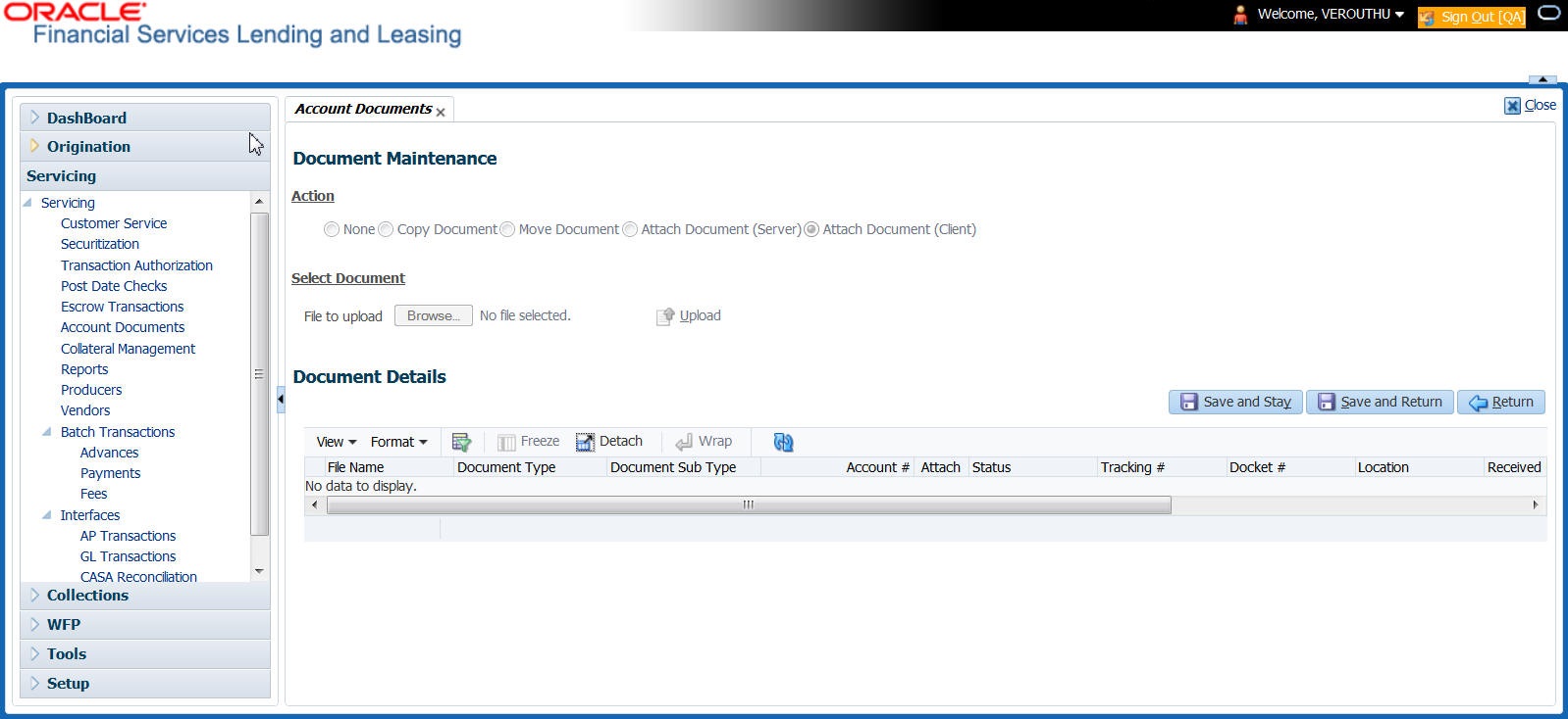 The Documents Maintenance screen allows for both the paperless storage of documents within Oracle Financial Services Lending and Leasing system, first with Accounts during the Lease origination cycle and later with accounts during customer service.
