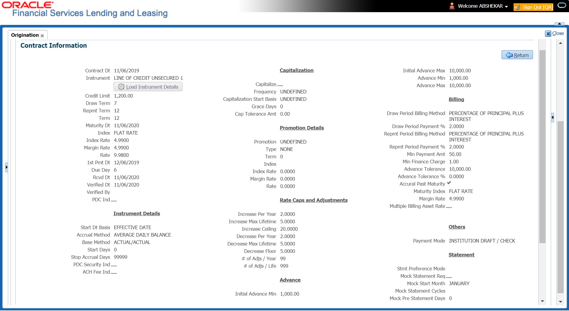 While working with the Contract tab for Line of Credit applications, you can either enter the contract details manually or make use of the ‘Suggest’ option which auto populates the contract details.
