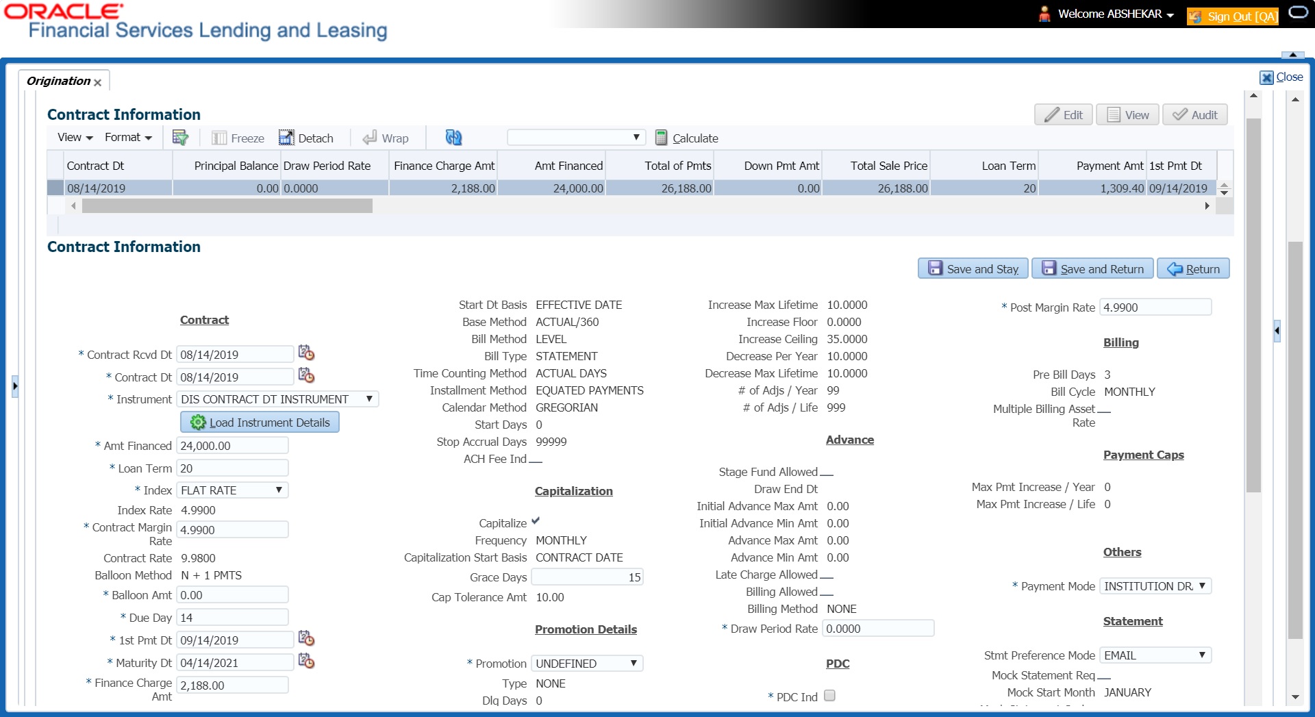 The screens associated with the Contract link are the core of the funding process. They allow you to perform the important task of completing the truth-in-lending details. These screens include information mandated by Regulation Z; information about the financed amount, the payment schedule, the total of these payments, the finance charge, the resulting annual percentage rate (calculated according to Federal/Central bank guidelines; that is, within 125% of the Treasury OCC calculated APR) for the conventional Loan, and internal rate of return for Islamic Loan. Use the Loan packet to supply the required information.
