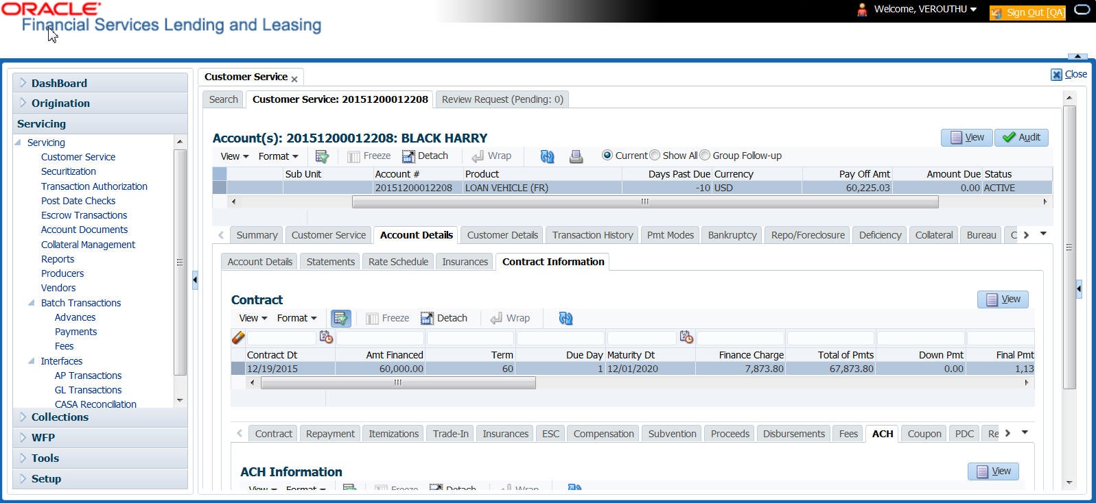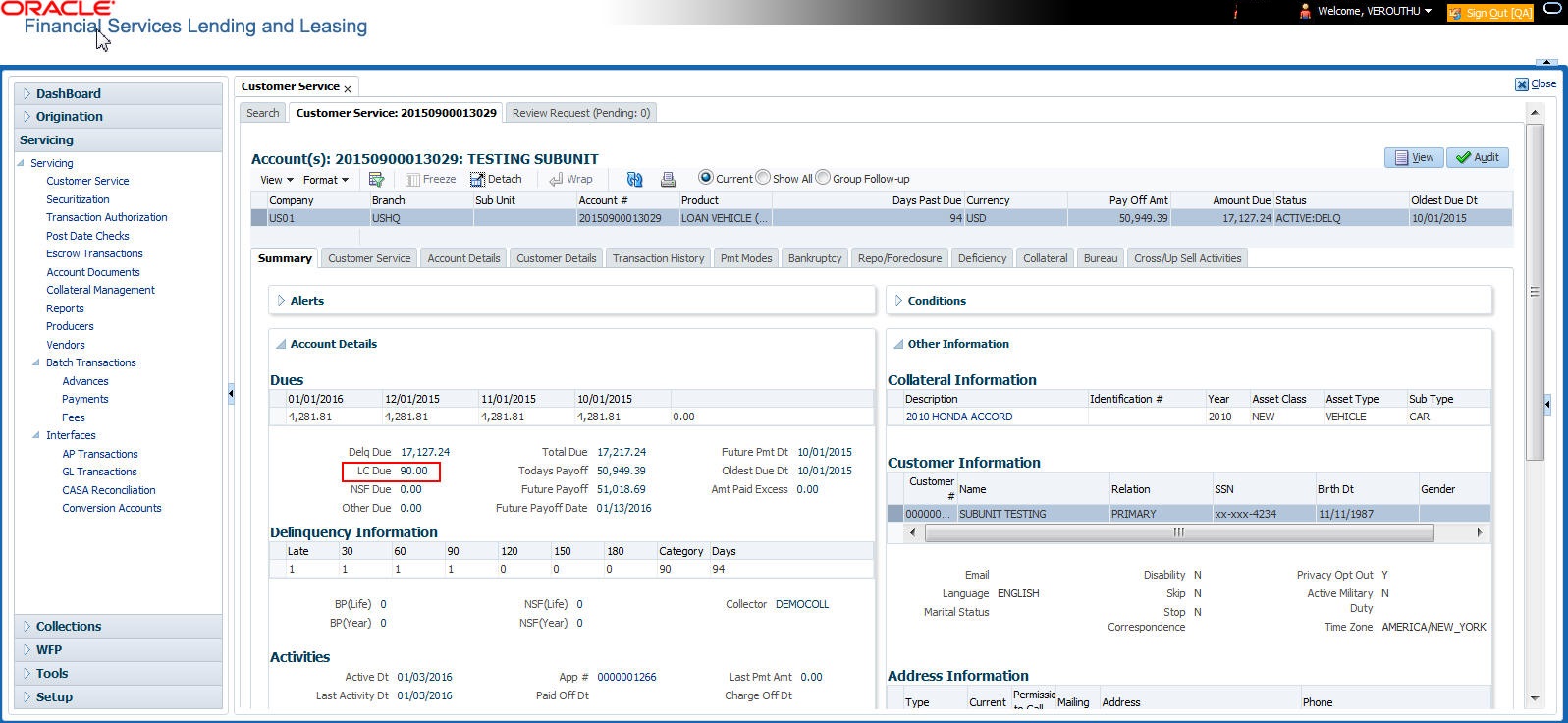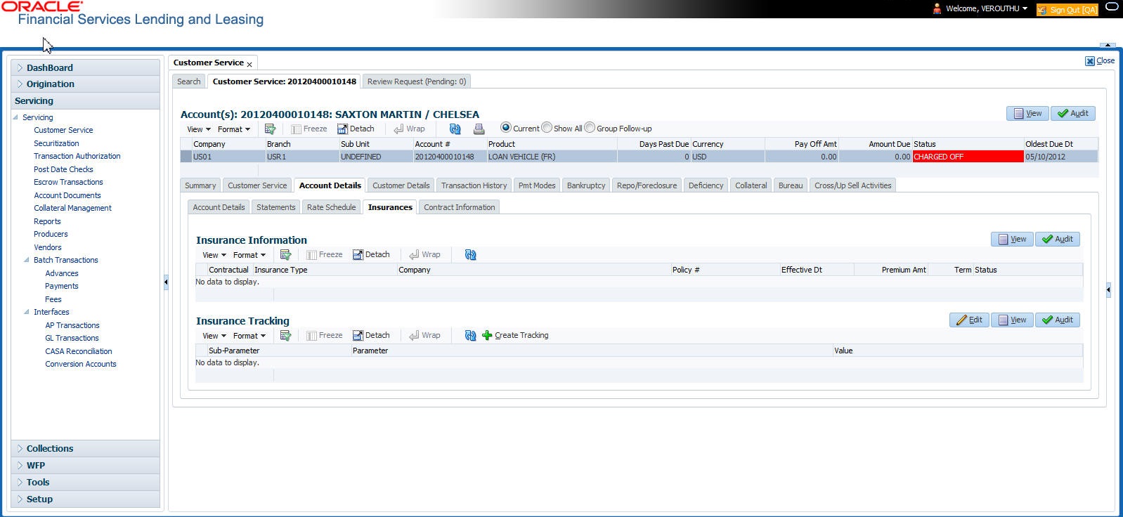 You can add financed insurance to an existing account with the INSURANCE ADDITION transaction. This transaction adds insurance premium amount to advance/principal balance on the Loan and adjusts the Loan receivables accordingly. The transaction also triggers the process to re-compute repayment amount for Loan. After you post the transaction Loan will be billed for newly computed payment amount and will be considered for delinquencies and fees calculations based on information on the Contract link’s Contract screen. The newly added insurance information can be viewed on Customer Service drop-down link’s Insurances link.