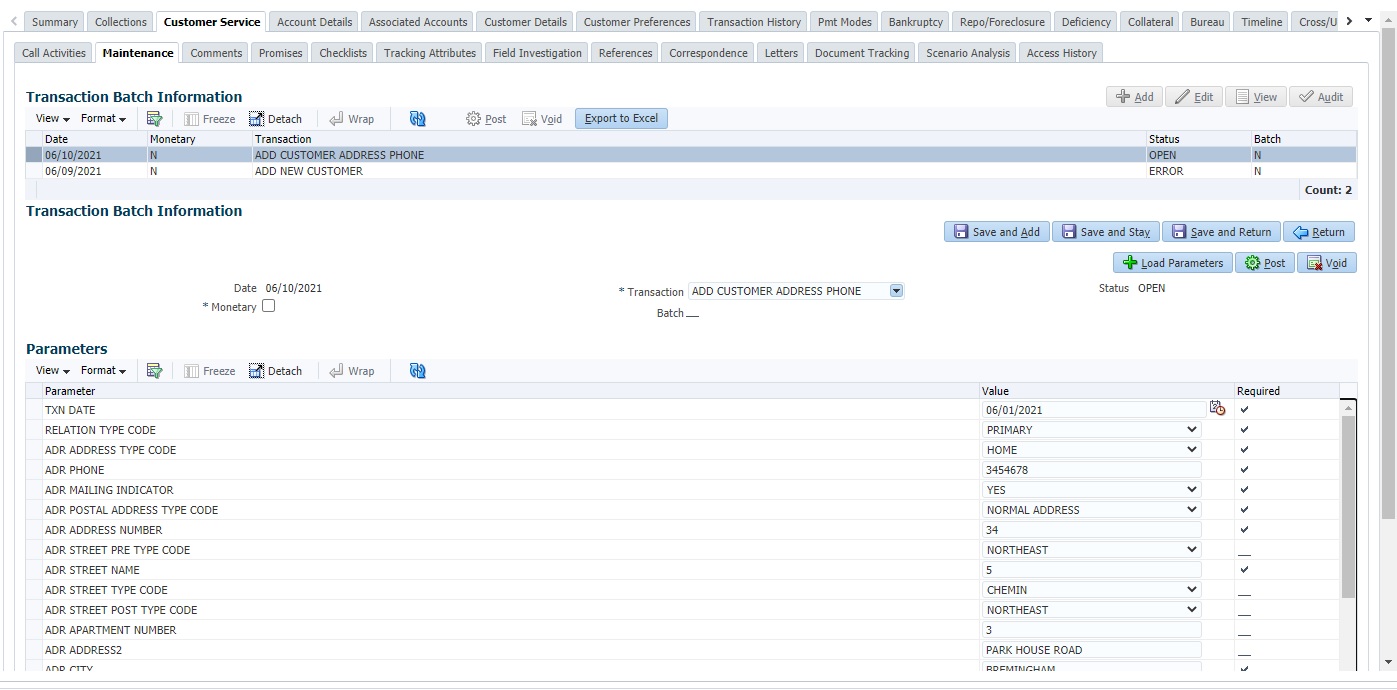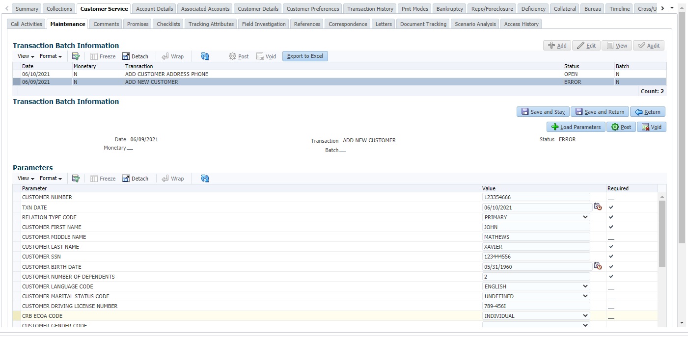 During the servicing stage of an account, you can add customer details into the system by posting ADD NEW CUSTOMER transaction in Customer Service > Maintenance > Transaction Batch Information section.