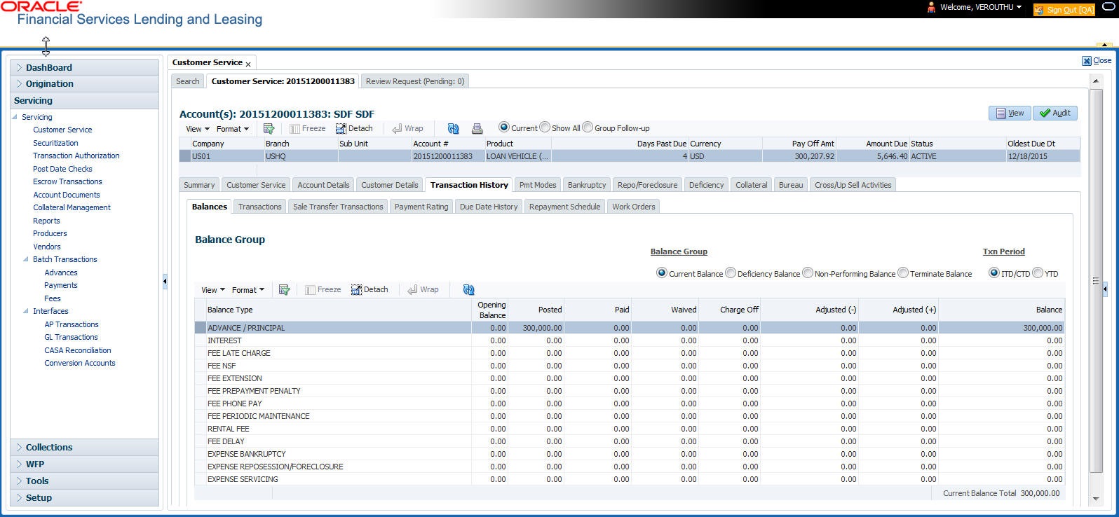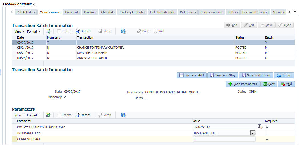 The Customer Service screen’s Maintenance sub tab enables you to post an array of monetary and nonmonetary transactions for any given account. The transactions that are available depend on responsibility of the Oracle Financial Services Lending and Leasing user, nature of account, and whether the account is a Loan.