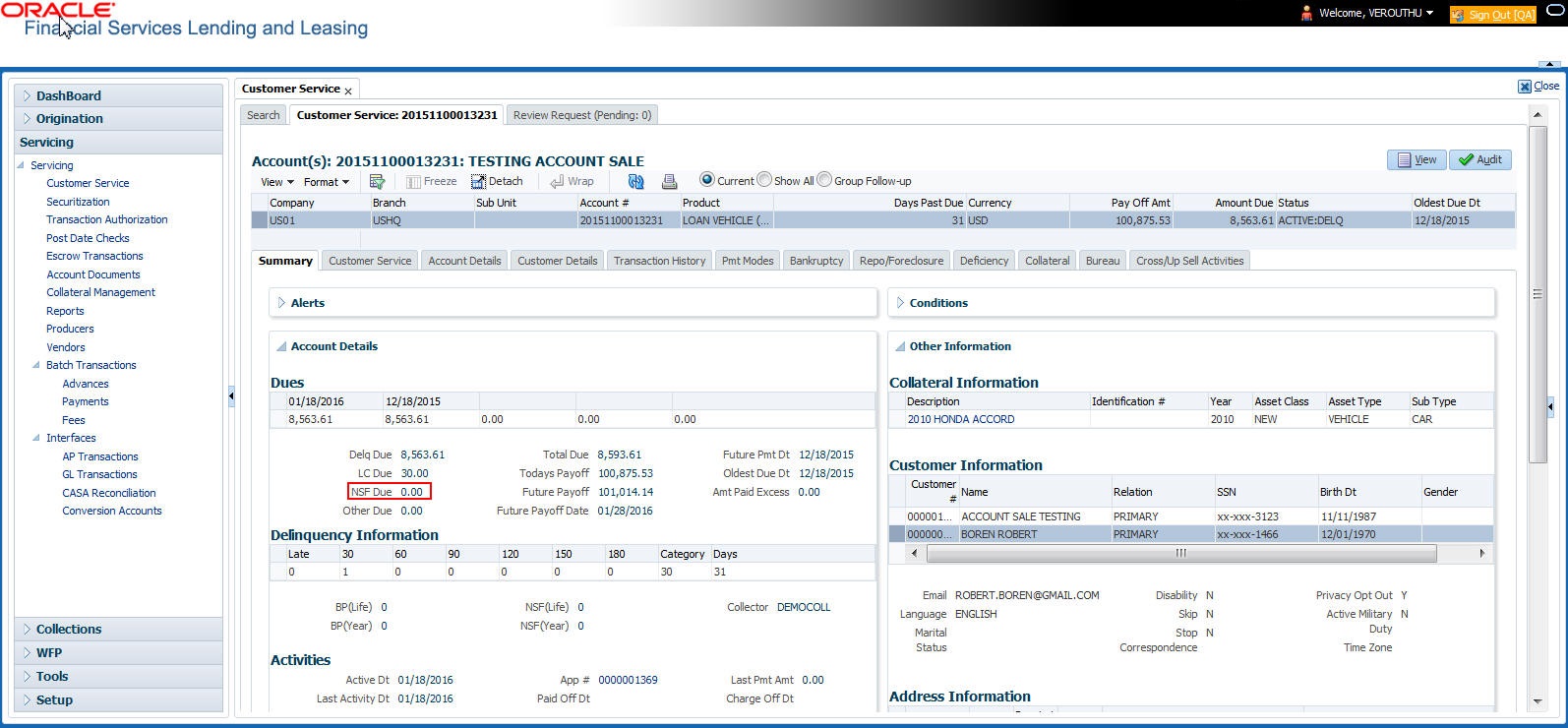Nonsufficient fund fees appear in the NSF Due field on the Dues section of Summary tab of Customer Service screen. This is the first screen to appear on the Customer Service screen when you load an account.