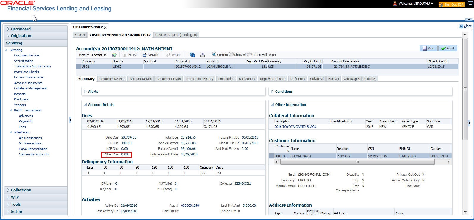 Repossession expenses appear in Other Due field on the Dues section of the Summary tab of Customer Service screen. This is the first screen to appear on the Customer Service screen when you load an account.
