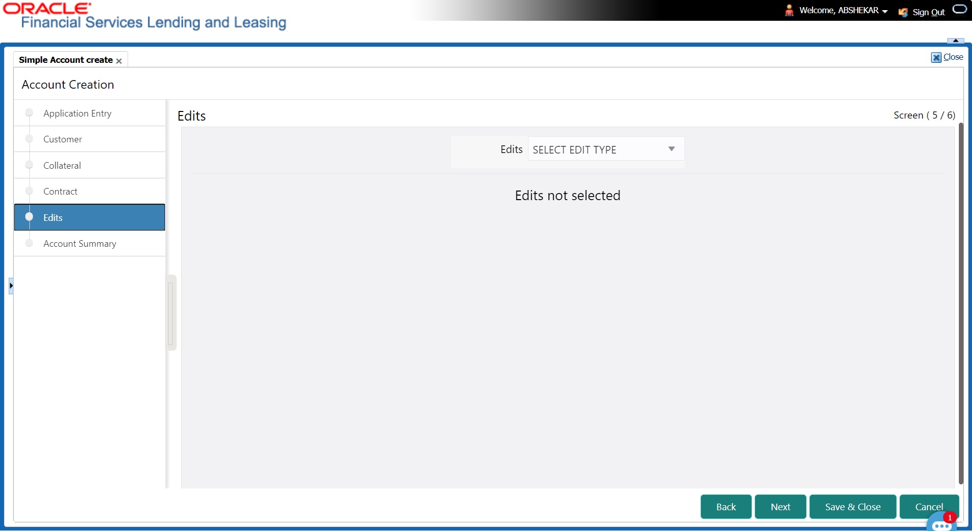 o An EDIT section is provided to show the application edits which are fired as part of Account Creation.