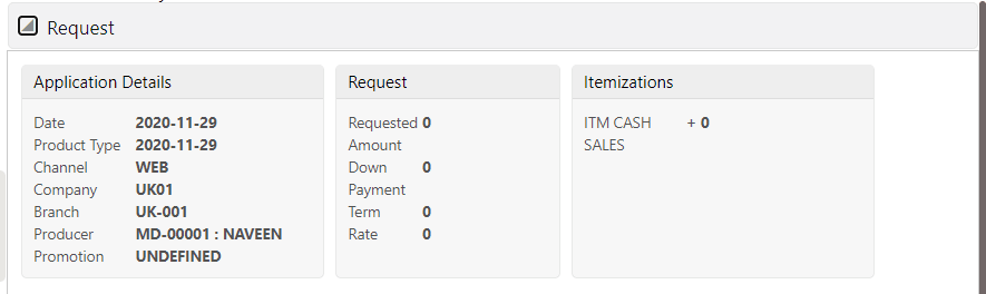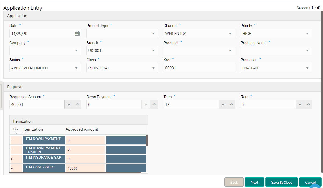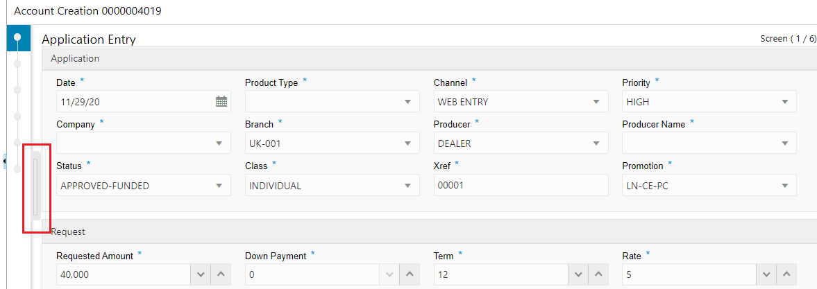 Provided the first screen in the process train ‘Application Entry’ with the following details