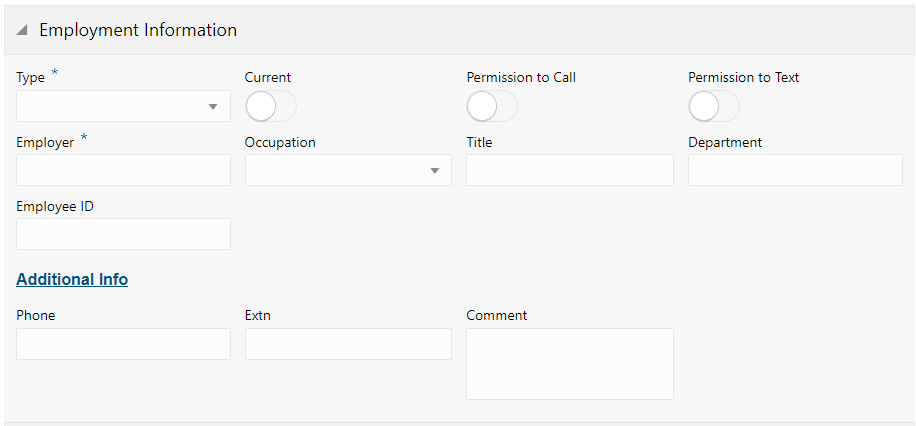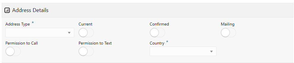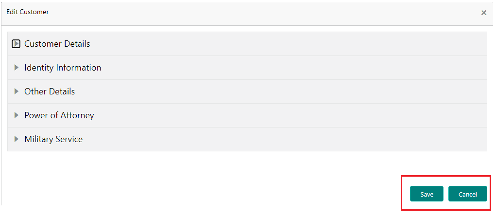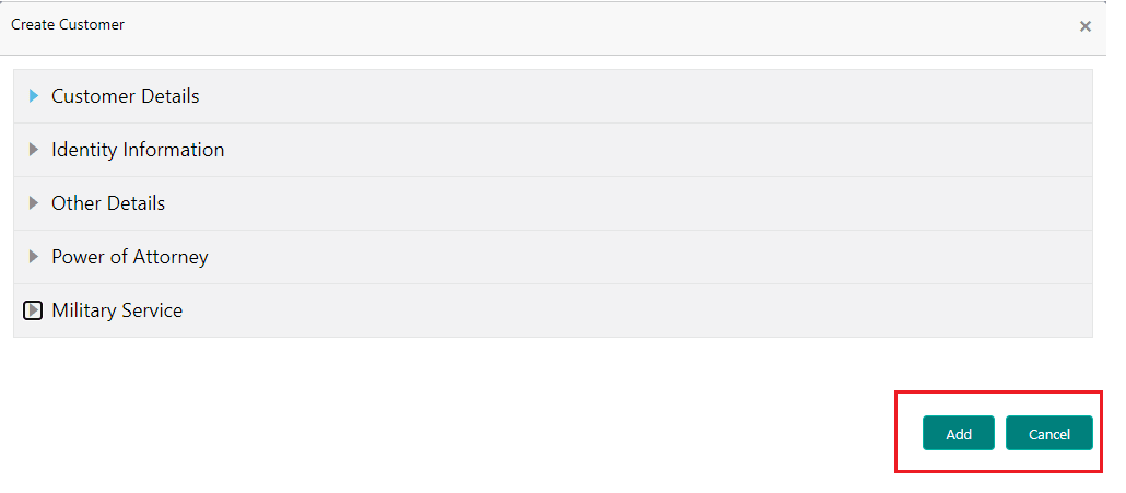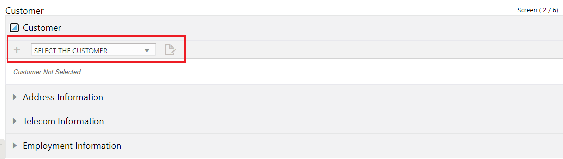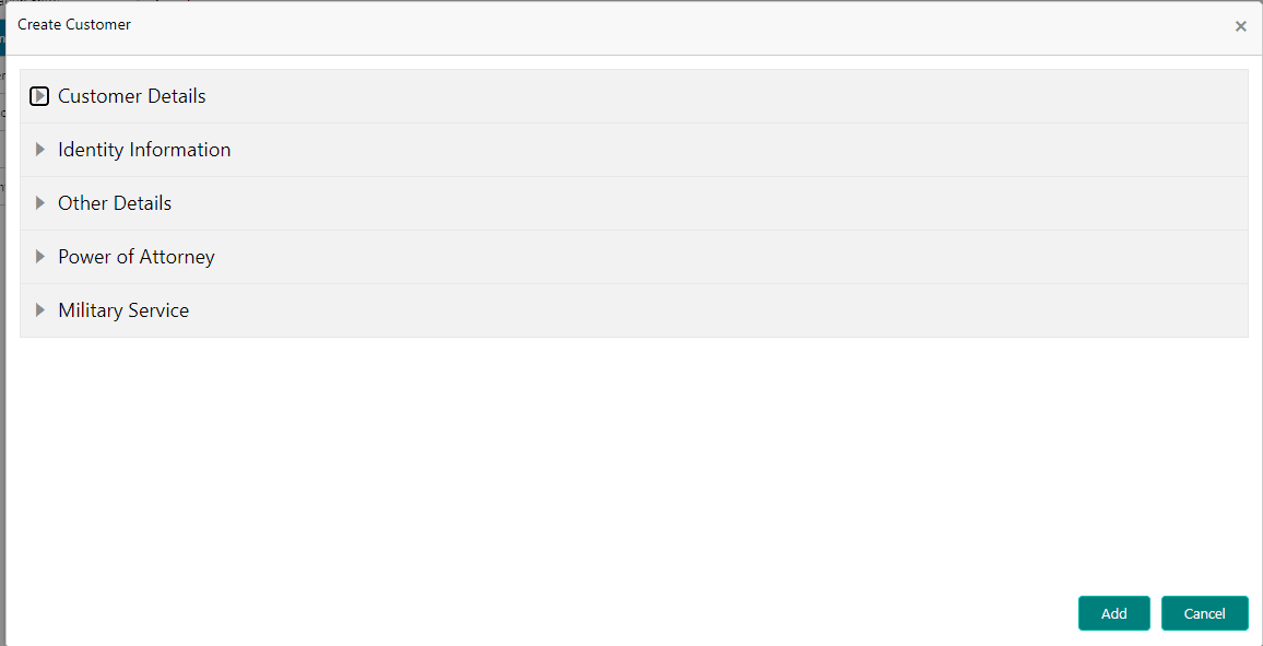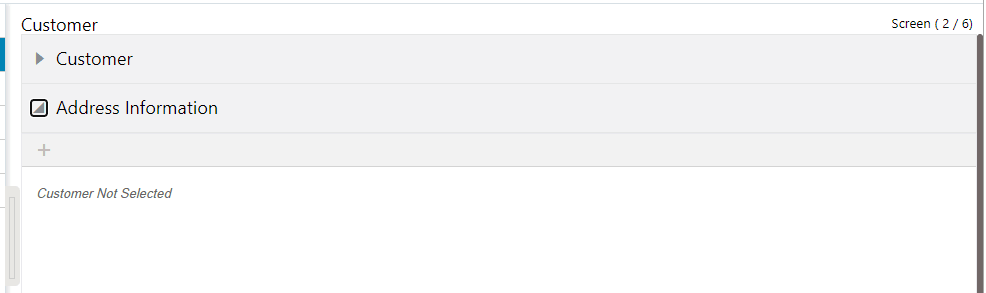 Provided ‘+’ button opens a new screen with 5 collapsible panes with header as Create Customer