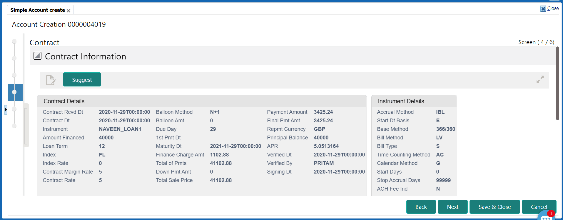 o Contract Section consist of a “Suggest” button which will provide best match contract and calculated contract parameters like Payment Amount, APR etc. by calling “Auto Contract” web service.