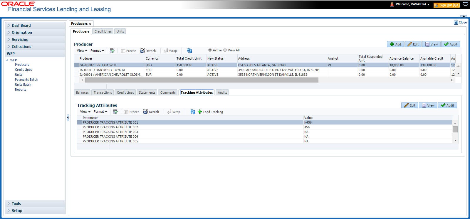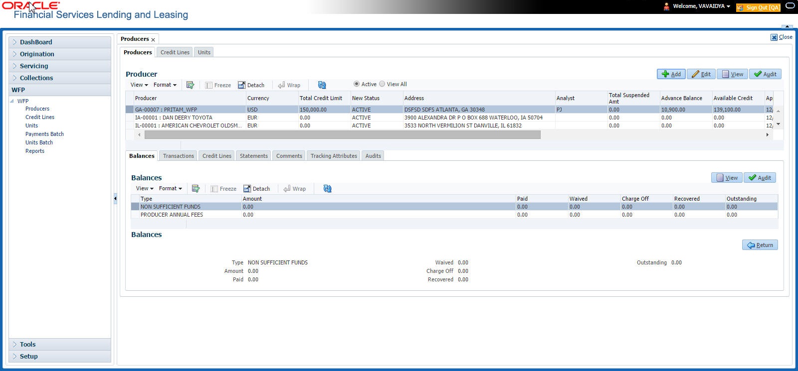 On the Oracle Financial Services Lending and Leasing home screen, click WFP > WFP > Producers > Balances