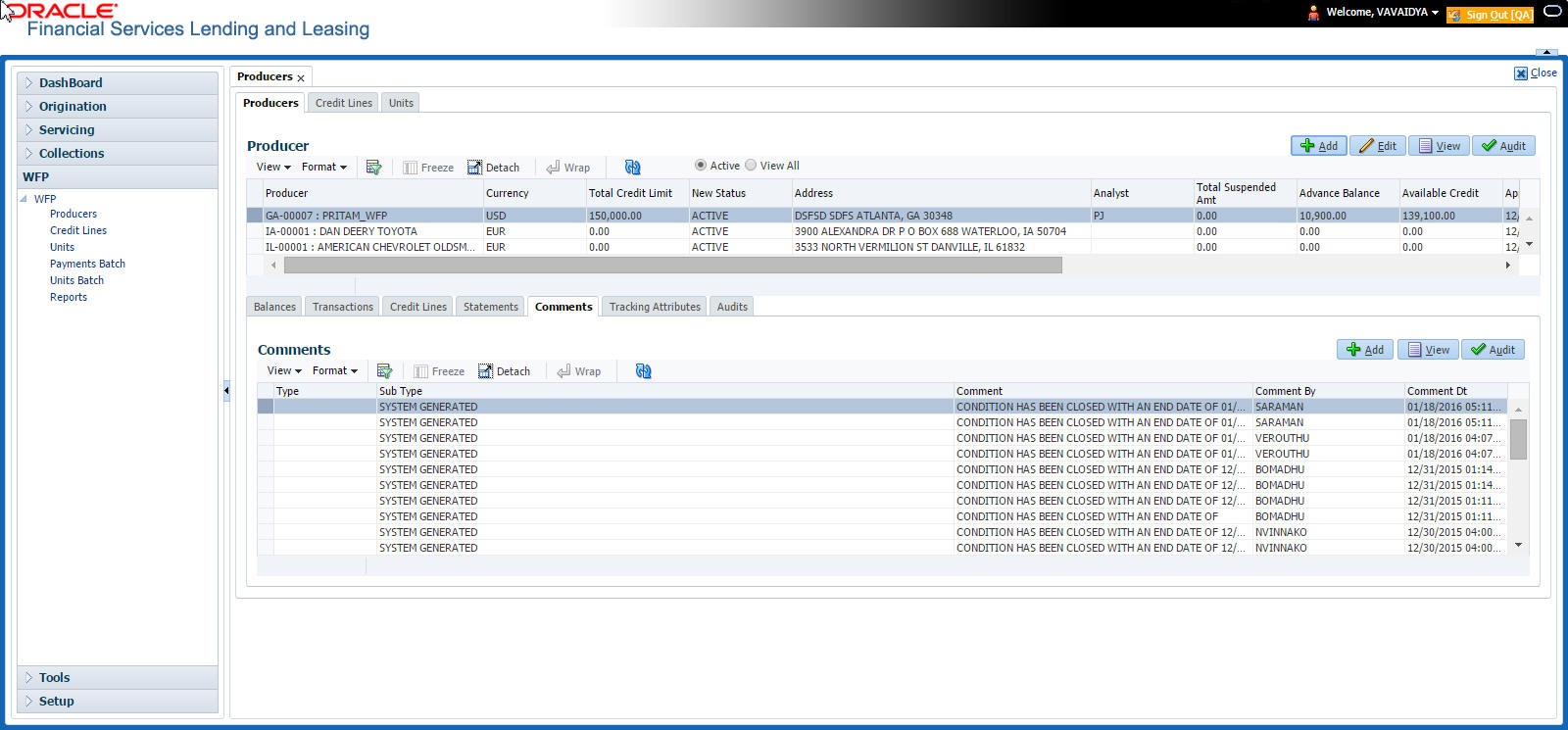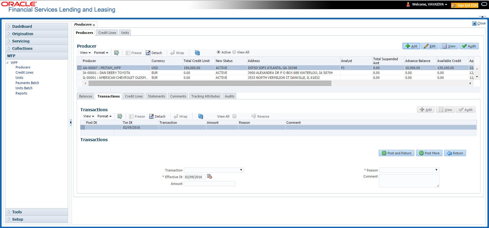 On the Oracle Financial Services Lending and Leasing home screen, click WFP > WFP > Producers > Transactions