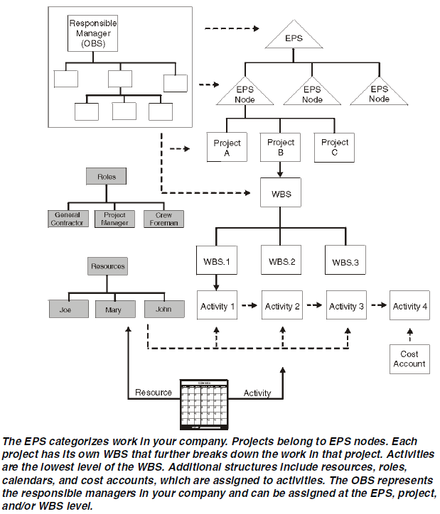 The following diagram illustrates how the data structures relate to each other in P6 EPPM.
