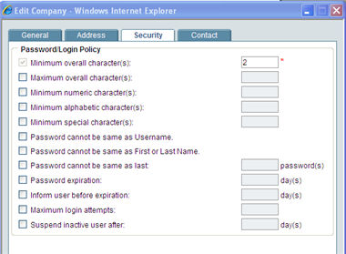 Sponsor company administrators can specify password security policies in the Security tab of the Edit Company window. By default, the minimum password requirement is set at one (1) character, meaning that the user is required to create a password with a minimum of one character. If a value is not entered in a field, the option is ignored.