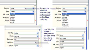 - Behavior Set, listing elements whose behavior is controlled by the master element (for example, a field that becomes Required, Disabled, or Disabled and Clear depending on the value chosen for the master element (for example, the Country chosen might dictate whether the Postal Code or Zip Code field is enabled for the user).