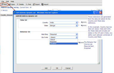 In the example in the following figure, the behavior set is Mail Stop and Zip Code. In this case, at runtime, depending on the Country chosen, either Mail Stop or Zip Code will become a required field, or will be disabled.