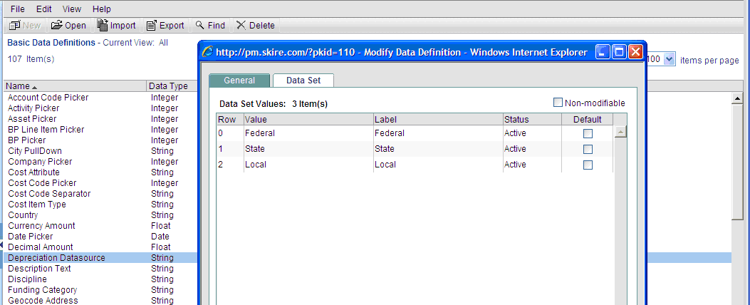 The list of available depreciation data sources is managed in the depreciation data source data definition data set. Below is a sample depreciation data source list.