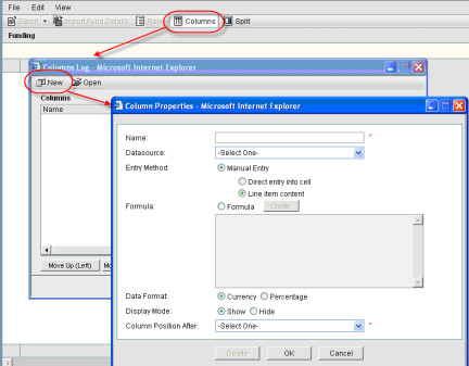 - Open the funding template and click the Columns button. The Column Log window opens, displaying the list of existing columns.