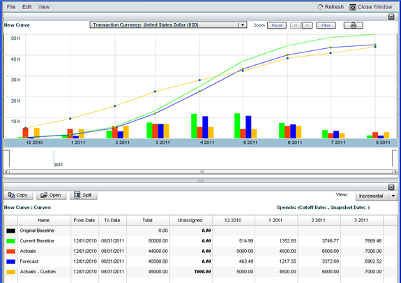 This option allows you to plot and analyze cash flow data for an entire commit record (including base commit, any change commits, and related invoices). You can choose a specific business process commitment record within the Project/Shell, such as a purchase order or contract, and track the cost information over time. Each commitment record can have one baseline curve.