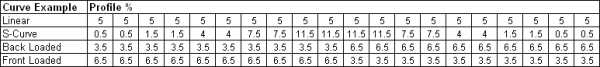 - Profile %: Starts at 0, with 20 remaining slots to enter the profile distribution percent values. You will enter incremental values in these slots. The total value of the profile % must add up to 100%. You cannot enter negative numbers in these slots. The values you enter will determine the shape of the curve, and distribution of the data.