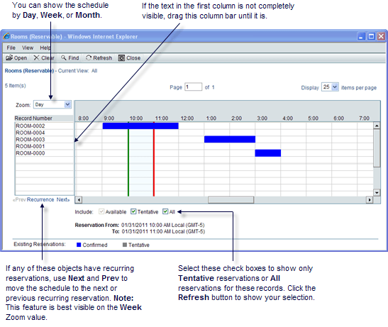 At the bottom of the data picker window, the Reservation From and To fields show the timeframe you specified in the From Date and To Date fields on the Reservation form. This timeframe is also denoted by the green and red lines on the schedule. If the object shows a reservation conflict at that time, you can change the timeframe on the picker before you select the object.