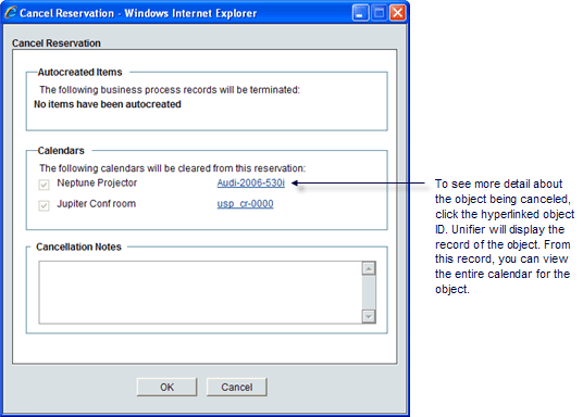 - All the objects associated with this reservation that will be canceled. In the example above, the room is being canceled as well as the projector that was reserved for the room.
