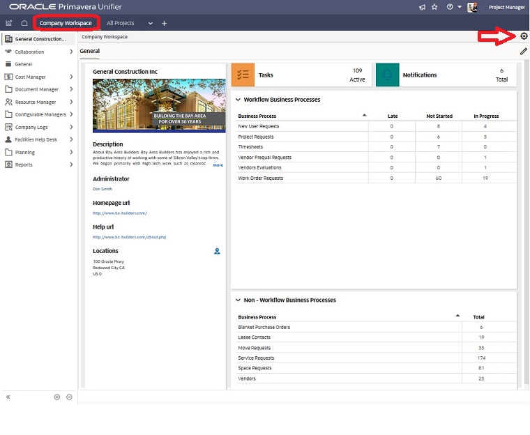 The following image shows the typical Admin mode for the Company Workspace tab: