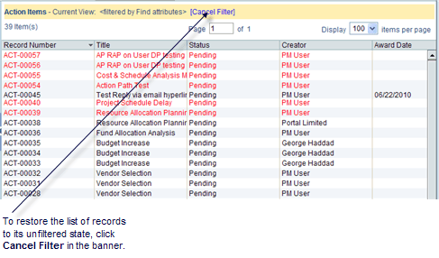 Floating Find windows display search results that include a banner across the top of the window. This banner indicates that the list has been searched, or filtered. To restore the list of records to its unfiltered state, click Cancel Filter in the banner.