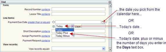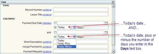 The floating Find window provides comprehensive search criteria for date fields. If the date field on the Find window includes an operator, you may have the option of making the search relevant to today’s date.