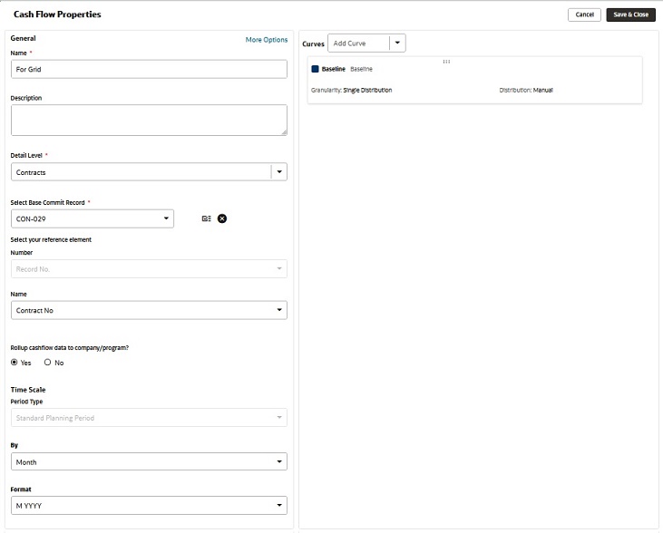 The Cash Flow Properties window is divided into two panes. The left-hand pane shows the General block and the right-hand pane shows the Curves block, as shown below.
