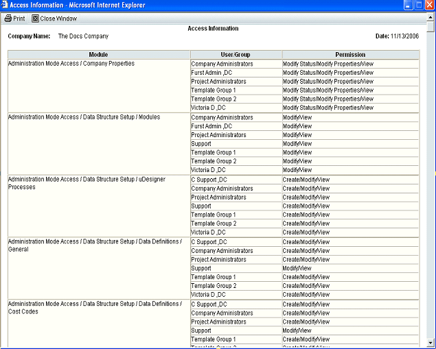 You can generate and print an Access Information summary report of user and group permission settings. The report will display all user and group permissions.