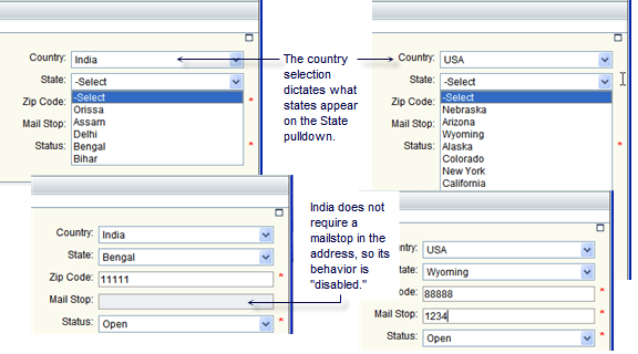 For example, a form might require both national and international addresses. Some countries or states within a country require a postal code with a mail stop extension; others do not. The country, state, and postal code fields become the dynamic data set. In this dynamic data set, the country is the master element; it dictates which states the user can choose from and whether or not the user must enter a mailstop extension. For this example, the dynamic data sets would appear on a form in Primavera Unifier as shown here: