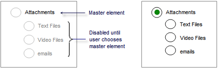 For example, you could use a radio button for "Attachments" to enable additional options for a user to choose. If the user clicks the Attachments button, additional radio buttons become active so the user can choose what type of attachments to include.