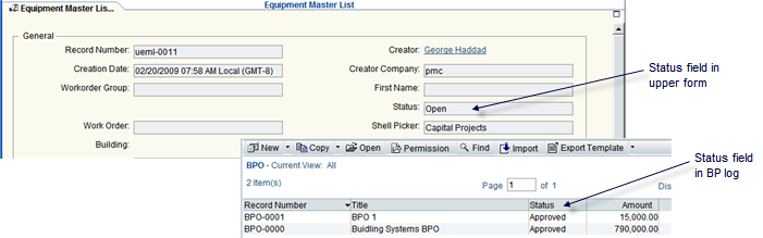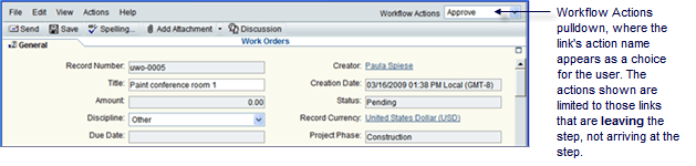 A record status indicates the position a form is in at any point in a business process, such as "approved," "pending," or "closed." Each business process includes at least one, and sometimes many, steps during its workflow. At each step, the Primavera Unifier user must apply a record status to the form. The status is the action that links two steps in a workflow. The action the link takes appears in Primavera Unifier as a choice the user makes on the form. This choice moves the task to the next step.