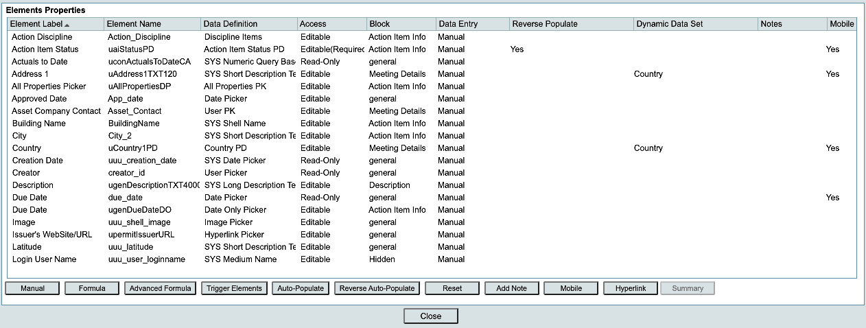 - On the Mobile Elements window, you can move the fields into the order you want them to appear on the mobile device. Click OK to close the window. As shown, the Mobile column will display a Yes value for every field that appears on the version of the form shown on the mobile device.