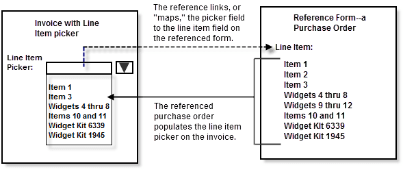 Likewise, if a form includes a line item picker, the user can select specific line items from a referenced form. To make a line item picker effective, you must specify what line items the user can select from the referenced form. Once you do this, the referenced line items will automatically populate those line item fields that the referenced and the current form have in common.