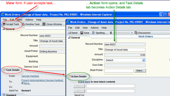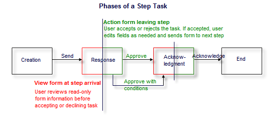 Part of understanding the workflow is considering each phase of a step. For most steps, there will be a "viewing" phase and an "action" phase. As a business process arrives at each step in a workflow, Primavera Unifier notifies the appropriate users if they are involved in the step. When they open the notification, Primavera Unifier displays a view-only form of the step’s task. Each user can choose to accept or decline the task implicit in this form. If the user declines the task, the step ignores the user. If the user accepts the task, the form becomes an action form where the user can enter or edit information and attach comments, line items, or documents, and forward the form on to the next step in the workflow.