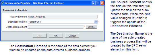 - In the Destination Element field, click the Select button and choose the name of the data element you want to be updated on the auto-created business process p or line item.