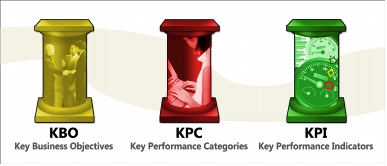 Within organizations, key business objectives prompt initiatives. These initiatives are defined using key performance categories. Key performance categories are then measured and displayed using key performance indicators.