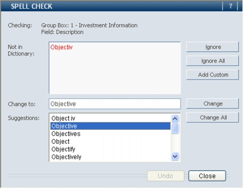 - Words that do not appear in the Spell Checker's standard and/or custom dictionaries appear in the Not in Dictionary box. You may choose one of the following options: