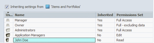 In the following example, exporting this object's security exports only its inheriting setting. Since all of its security rows are inherited, they are not exported.