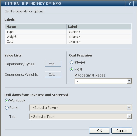 In the General Dependency Options dialog box the dependencies table columns labels, associated value lists, drill-down target, and cost precision are displayed. This section describes how to edit the Workbook Dependencies Options dialog box.