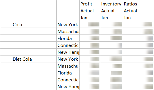 "California"->"Actual"->"Cola"次の対称グリッドについて検討します。このグリッドは、各製品に同じ市場とシナリオ(Actual)が示されているため、対称です。