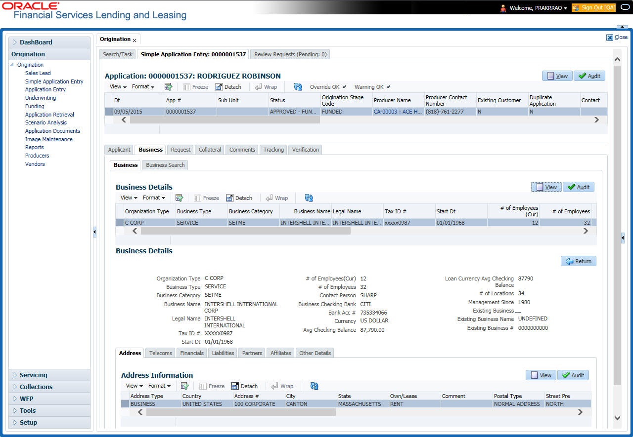 Oracle Financial Services Lending and Leasing can record SME business related financial information and business partners on the Business screen to assist in approving Lease application during underwriting. The Business Applicant screen is available for Lease and contains the following sub screens:
